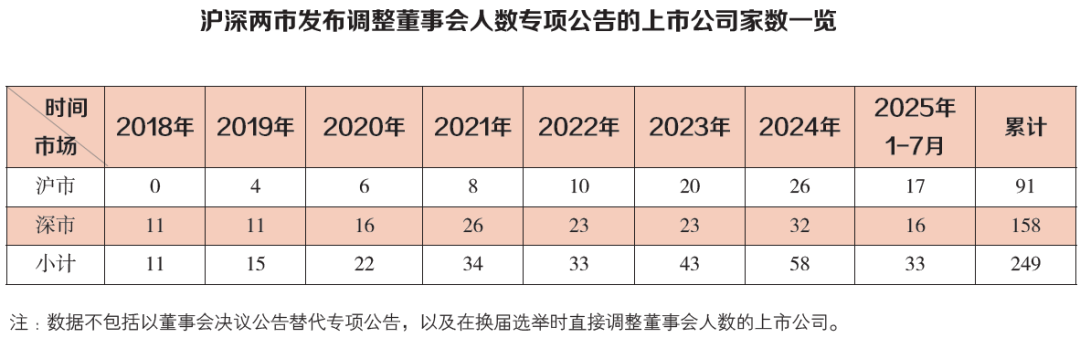 从上表数据可以看出,2018年至2020年,以及2021年至2023年,前后两个三年存在明显的数量差距,2024年至2025年发布调整董事会人数专项公告的公司更是增长明显。由于增减董事会人数通常会在董事会换届、董事辞职或增选董事的特定期间进行,因此,上述这些进行董事会人数调整的上市公司,确实有些耐人寻味。