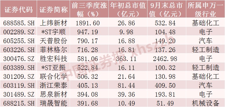 前三季度A股十大牛股分别为上纬新材、*ST宇顺(002289)、天普股份(605255)、菲林格尔(603226)、胜宏科技(300476)、*ST亚振(603389)、联合化学(301209)、浙江荣泰(603119)、思泉新材(301489)、瑞晟智能,其中涨幅最大的上纬新材累计上涨1891.60%,*ST宇顺涨逾940%,天普股份、菲林格尔均涨逾700%。