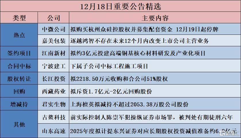 嘉美包装(002969.SZ):逐越鸿智不存在未来12个月内改变上市公司主营业务或对主营业务进行重大调整的计划中微公司(688012.SH):拟购买杭州众硅控股权并募集配套资金 12月19日起停牌【项目投资】江南新材(603124.SH):拟约3亿元投建高端铜基核心材料研发及产业化项目【中标合同】太原股票配资网